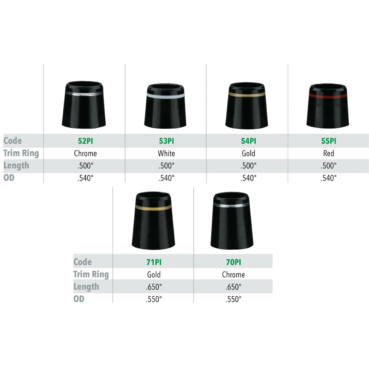 The GolfWorks premium .370″ parallel iron ferrules with cosmetic trim rings have been updated to include tapered ferrules with modern lengths and outside diameters to fit a wide variety of iron heads and will require very little, if any, turning down. All of The GolfWorks ferrules are Pre Washed with high gloss finish and have a 19 degree countersink allowing a cushion of epoxy to form between the top of the hosel and the inside of the ferrule to prevent shaft breakage. 1 Dozen Ferrules