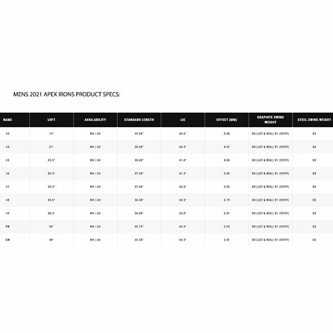 Introducing the NEW Apex 21 Irons. This is an extraordinary level of forged performance and craftsmanship never seen before. It’s the first forged iron designed with Artificial Intelligence for faster ball speeds, and that’s just the beginning. Our world-class R&D team has improved spin consistency using A.I., increased forgiveness from our massive Tungsten Energy Core, and enhanced the shaping for even better turf interaction. Apex delivers superior performance with iconic feel on every swing.