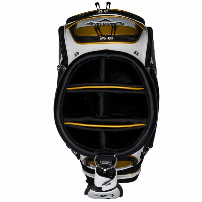 We brought the look and feel of our Tour staff bag to a carry bag featuring a full length apparel pocket, velour-lined valuables pocket, Tour branding, and a logo ready ball pocket.