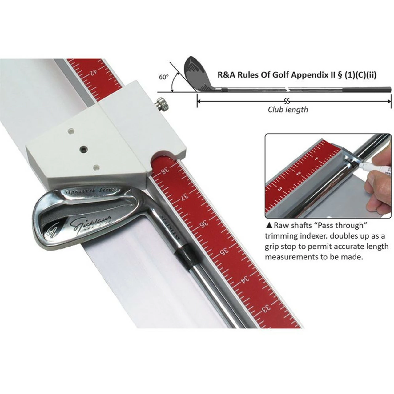 The 3 in 1 Bench Ruler integrates club length measurements with a tip and butt trimming jig for raw shafts. We’ve also incorporated a tip jig for the R&A Rules Of Golf Appendix II rule for measuring the length of golf clubs to be played at officially sanctioned events.This ruler features a “Z” frame that restrains the shaft and places the embedded high visibility ruler above it for a clear view of the numerals. A gauging slider gives the exact length of the club or shaft. Reversing the gauging bloc from square transforms the ruler to the R&A and USGA 60 degree length conformance gauge. Marking shafts accurately for tipping or butt trimming is made easy by the pass through indexer extending its function beyond just a ruler for conformance measurements.