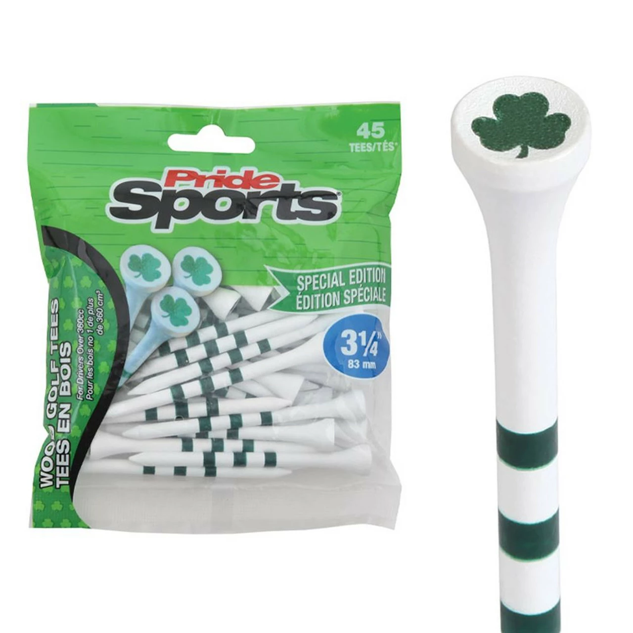 Pride Shamrock Novelty Tees are made from 100% Hard Wood for superior durability. Shank rings provide consistent tee height. Available in 2 3/4′ and 3 1/4″ length options. (45 count package)